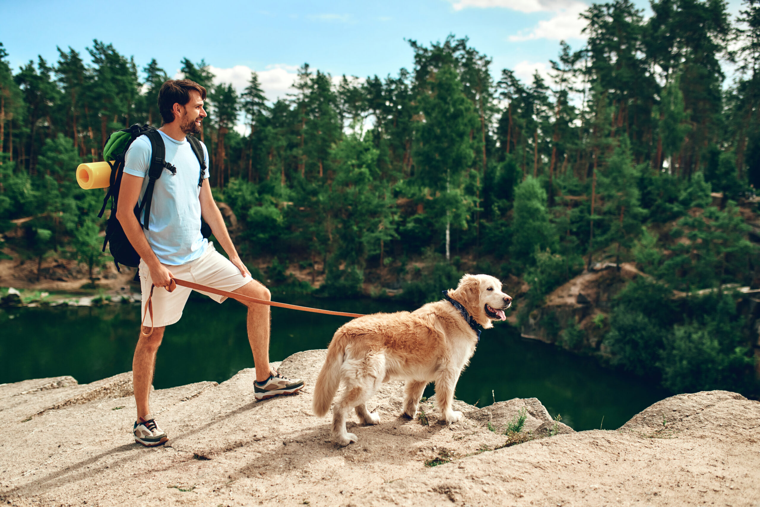 A male hiker with a backpack and a labrador dog stands on a rocky peak, looking at the river and forest. Camping, travel, hiking.